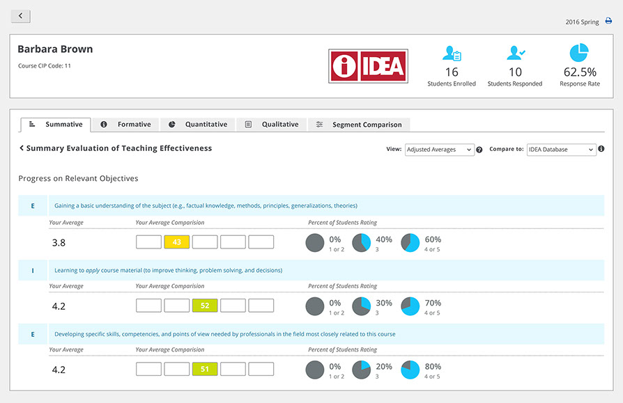 One of the best ways to infer teaching effectiveness is to examine student ratings of progress on relevant objectives that have been chosen as Important or Essential. The average of these ratings provides a good indication of how successfully objectives were reached in the course. Consider the ratings in each course report as well as ratings over time. See the Formative tab for suggestions about which Teaching Methods you might consider using more to improve progress on your chosen Learning Objectives.