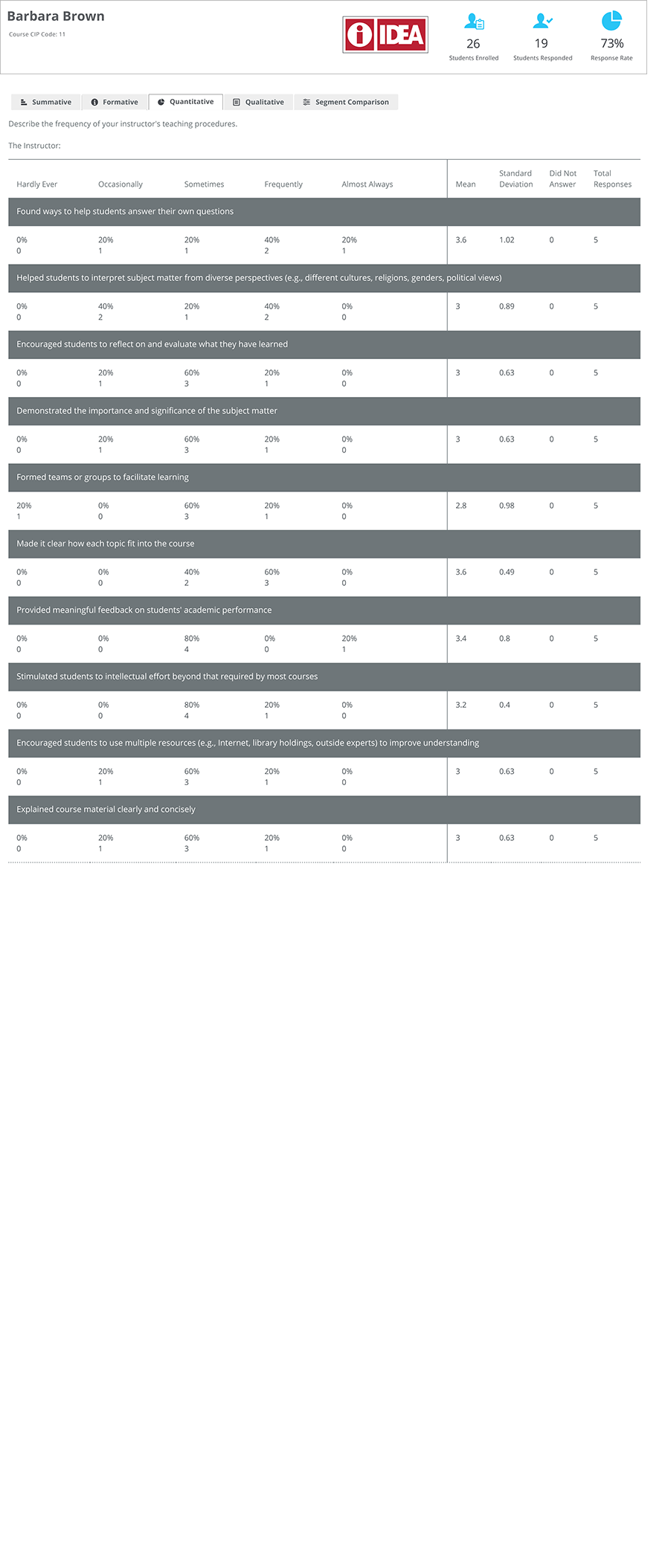 Looking at the distribution can sometimes be enlightening. For instance, if a class is split with half rating a number of items on the high end of the scale and half on the lower end, it may indicate that there was an issue with a particular group of students. Perhaps students who came to this class well-prepared fared better with the instructor's approach, while those who were not prepared did not succeed with the instructor's approach. While the data here does not tell you that specifically, combined with other information, it may help you understand the overall feedback more effectively.